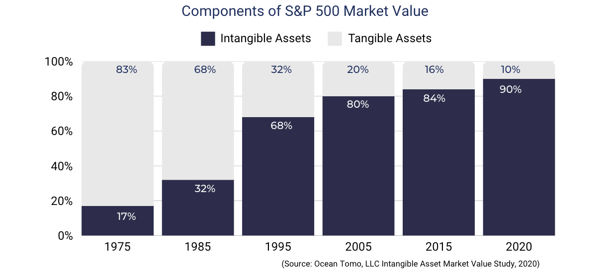 90% of the S&P 500 market value is composed of intangible assets (IP rights, reputation, and data), according to Ocean Tomo.
